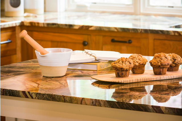 Natural stone countertops, such as these designed by