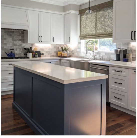 Our clients dreamed of a brighter and more timeless kitchen for a long time because their current kitchen was the exact opposite. It had dark cabinets with black granite countertops and backsplash and felt outdated. They wanted a space where their family would love to gather and that would feel welcoming, airy, and light. We knew that the base cabinet color would be white to give them that fresh, crisp, new start they were looking for. When it came to choosing finishes, Vadara countertops with its soft grey veining and white base were an easy choice since they brought in depth and perfectly complimented the multi-grey tone backsplash.