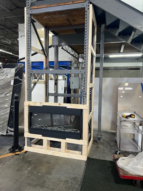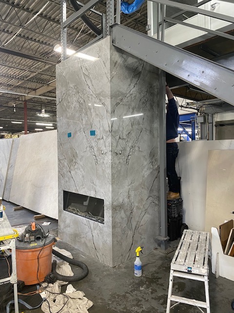 A mezzanine stairwell in the showroom created the perfect opportunity to showcase Neolith with a slim profile fireplace. Although it’s a narrow area, there was plenty of space to frame out the fireplace. And since Neolith is so thin (available in ¼” or ½” thickness) it was the ideal product to cover the flat surface.