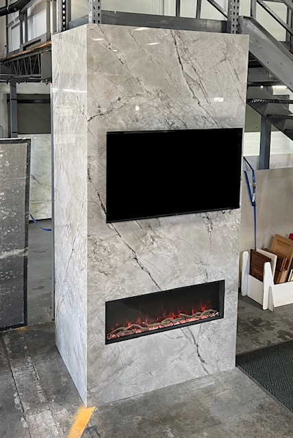 Ultra-slim Neolith is one of the most flexible and versatile surfacing materials available today. It can be used for both residential and commercial projects and is suitable for everything from building facades and large format flooring to kitchen countertops and backsplashes. Another wonderful thing about Neolith is that it comes in a variety of colors and textures, including those that are a nearly exact match for natural stone. To show off the versatility and beauty of this unique surface, we created a sleek combination fireplace/tv wall in our Westwood, MA showroom.